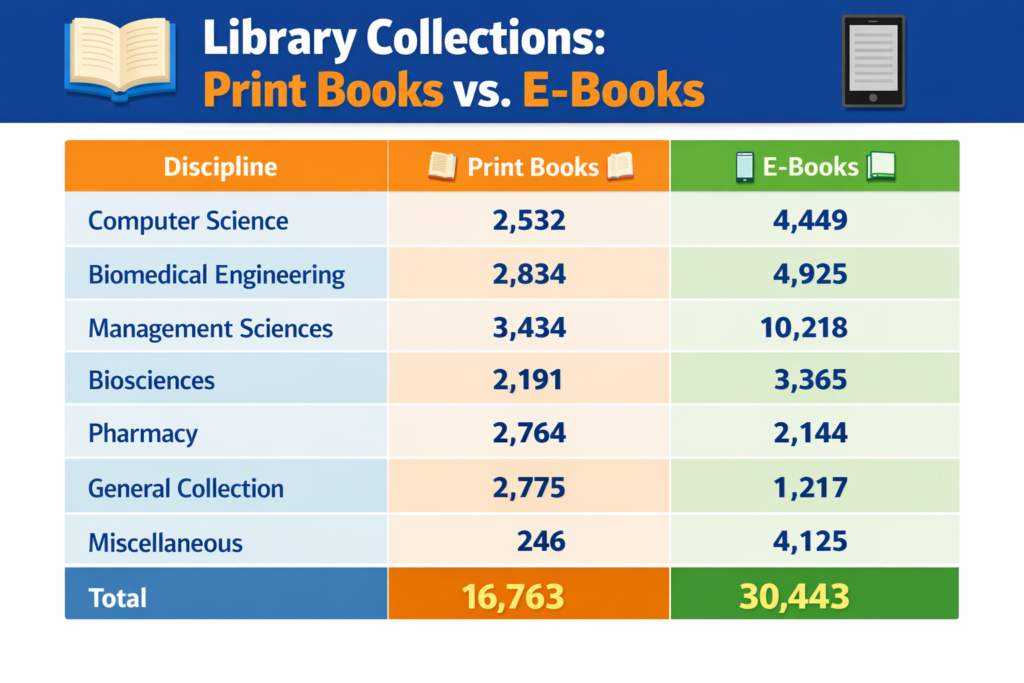 The collection covers a wide range of disciplines including management sciences, computer science, pharmacy, biomedical sciences, engineering, humanities, and general literature.