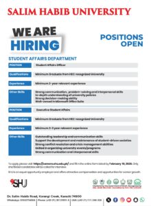 The Student Affairs Department at Salim Habib University is hiring a full-time Student Affairs Officer and an Executive Student Affairs.
